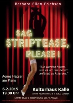 Das von Barbara Ellen Erichsen dargebotene Ein-Frau-Stück über eine Ansagerin in einem Striptease-Lokal, die das Warten auf die Tänzerin Andrea - Attraktion des Abends - überbrücken muss und dabei eine amüsante, doch tiefgründige Show in der Show darbietet.